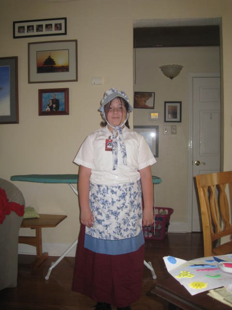 The long skirt is just part of a sheet. I cut a VERY rough rectangle of fabric from the sheet and put elastic in the waist. I think it took me about 5-10 minutes to make! The apron was the easiest part. I just cut a pillowcase and hemmed the cut edge. I used ribbon to make the ties. That took maybe 5 minutes! The hardest part was the bonnet. The main cap part is a rectangle with elastic at the nape of the neck and the remaining 3 sides gathered and sewed to the brim. I used the remaining part of the pillow case to make the cap and ties. For the brim, I found a coordinating fabric in my stash of scraps.